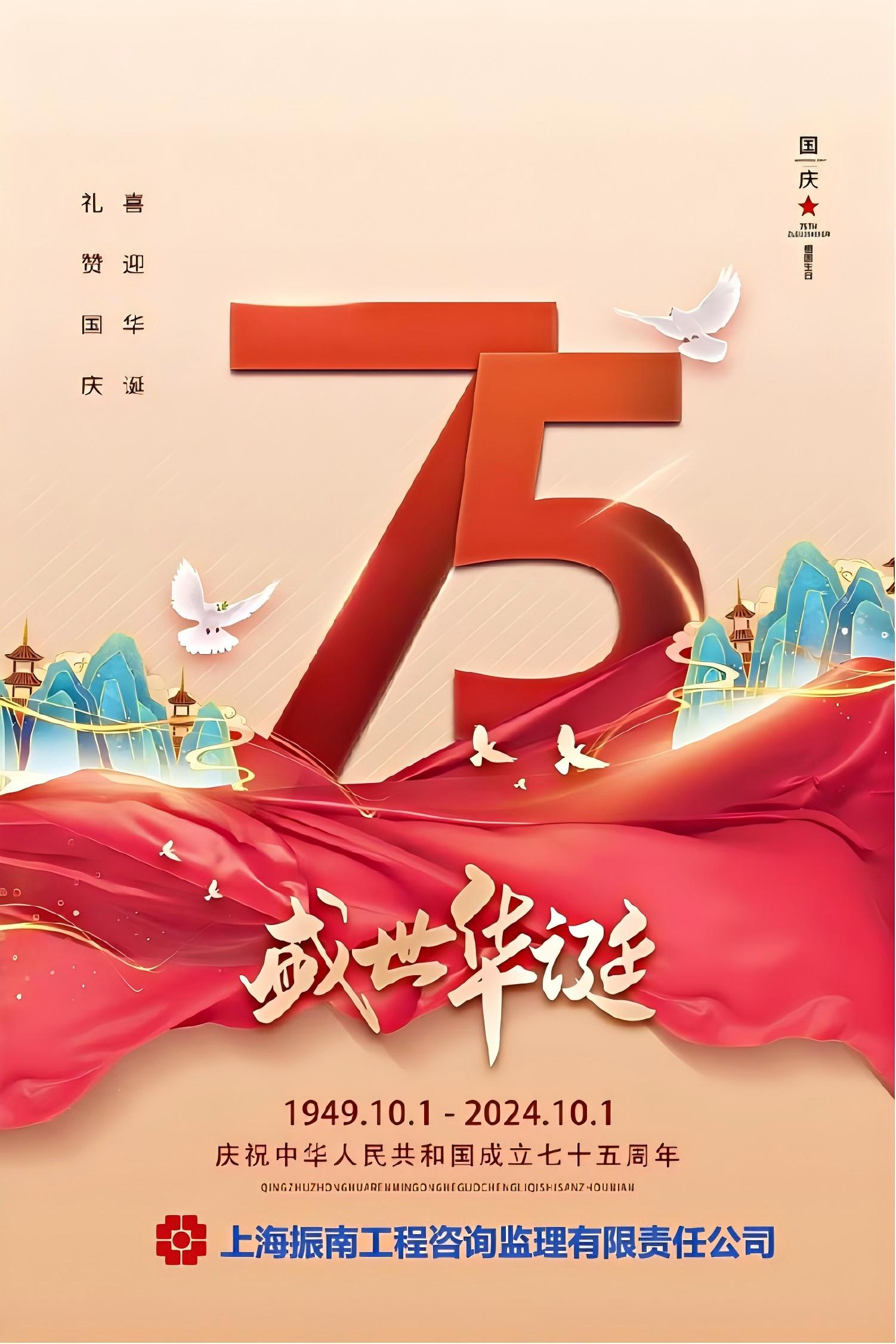 山河为颂,礼赞祖国 璀璨星河,共鉴时代新章 筑梦灯火万家,同庆盛世中华 七十五载栉风沐雨 金秋十月,举国同庆 家和国盛,繁花似锦 热烈庆祝新中国成立75周年 祝福祖国繁荣昌盛,国泰民安 在此也祝 各界领导、公司全体员工、公司合作伙伴 以及社会各界关心与支持公司发展的朋友们 国庆快乐!身体健康! 工作顺利!阖家幸福!